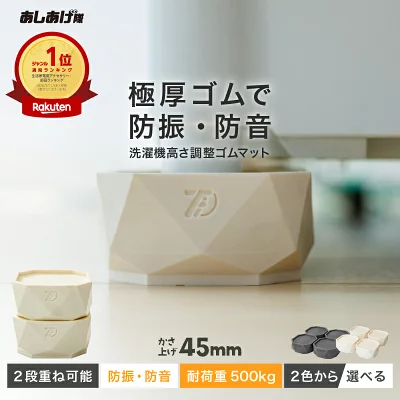 TFi-9045(あしあげ隊)は、防振・防音・掃除のしやすさ・高さ調整といった複数のニーズに応えるゴム製洗濯機かさ上げ台です。