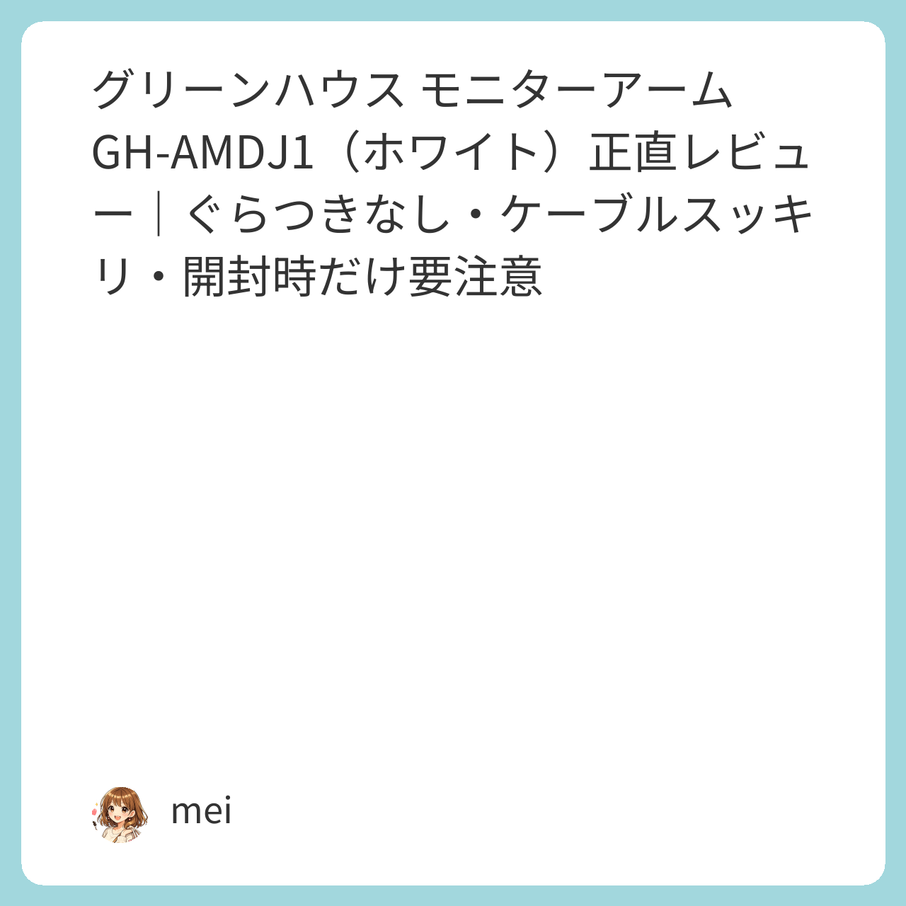 前回レビューしたホワイトのゲーミングモニター(GH-ELCG238B)に合わせて、同じグリーンハウスのショップでホワイトのモニターアームも購入しました。ぐらつきなし・動きスムーズ・ケーブルガイドでデスクすっきりと使い勝手はとても良いのですが、開封時にひとつだけ知っておいてほしい注意点があります。購入前に必ずチェックしてくださいね。